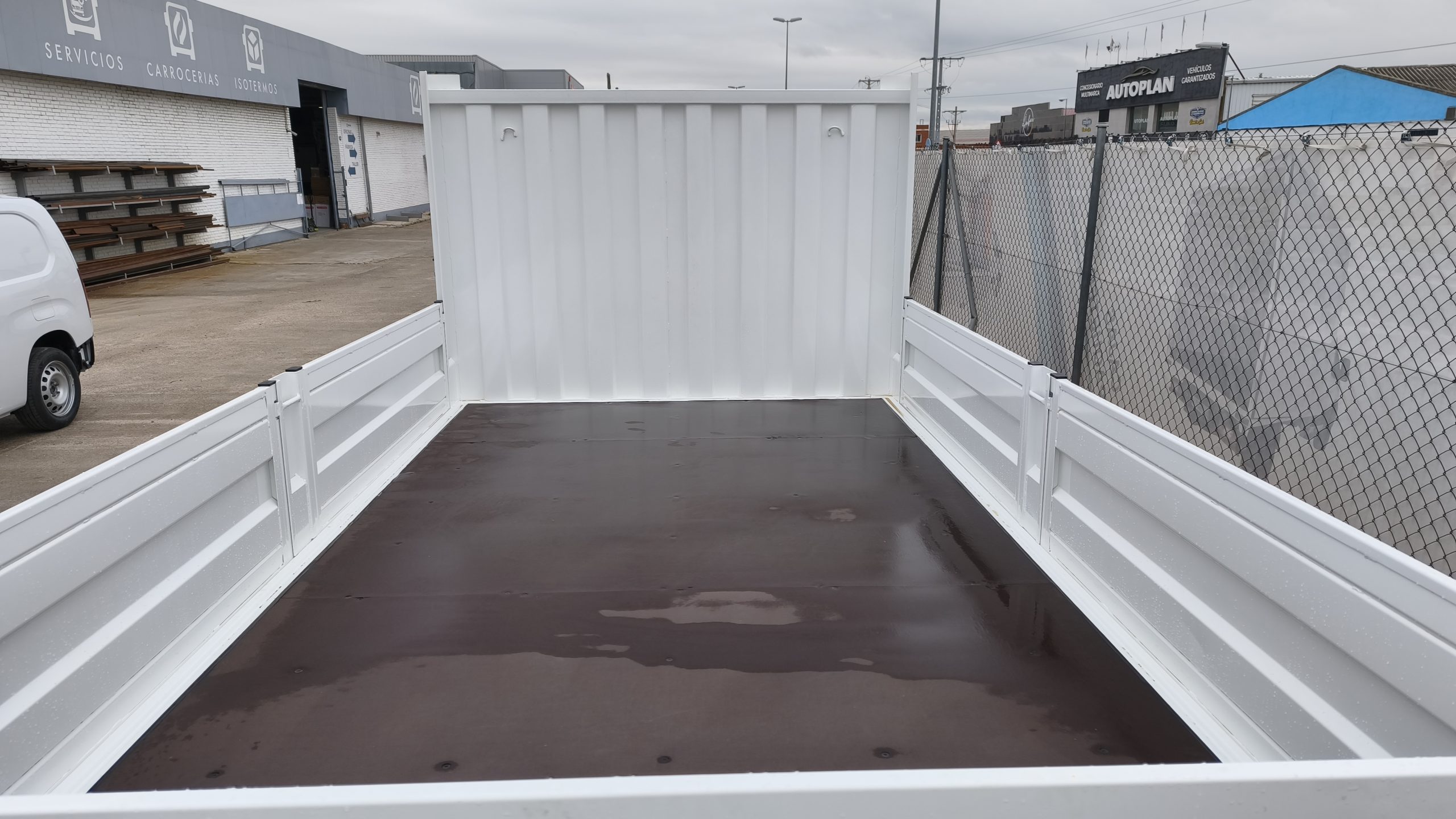 Caja cerrada tipo sandwich, con piso de tablero finlandés, techo translúcido, bandas de protección para mudanzas, escalera plegable trasera. .